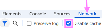 Para desactivar el guardado de la memoria caché, sigue estos pasos: abre Chrome → menú (3 puntos en la parte superior derecha) → Más herramientas → Herramientas para desarrolladores → Network → marca la opción Disable cache como se muestra en la imagen