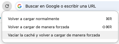 Para borrar la caché del navegador Chrome de forma manual, sigue estos pasos: abre Chrome → haz clic en el menú (los 3 puntos que están en la esquina superior derecha) → selecciona Más herramientas → Herramientas para desarrolladores → haz clic derecho sobre el icono de recargar la página → elige Vaciar la caché y volver a cargar de manera forzada.