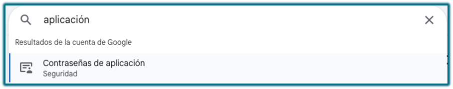 Buscamos la palabra aplicación en el buscador y seleccionamos Contraseñas de aplicación