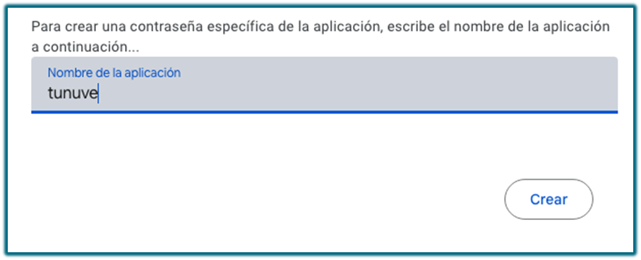 Informamos el nombre Tunuve en nombre de la aplicación que vamos a dar autorización para el envío de mail y pulsamos crear