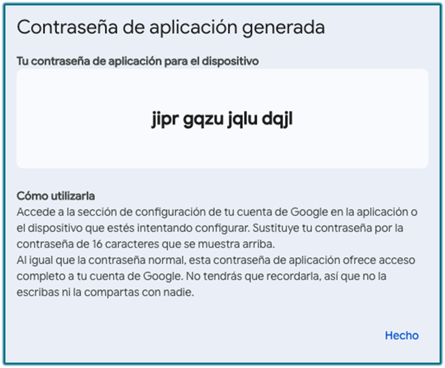 Nos generará una contraseña para la aplicación: