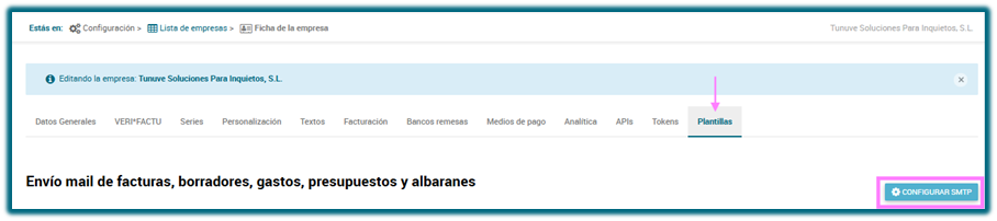 Perfil empresa: Configuración>Ficha de empresa>Plantillas>Botón Configurar SMTP