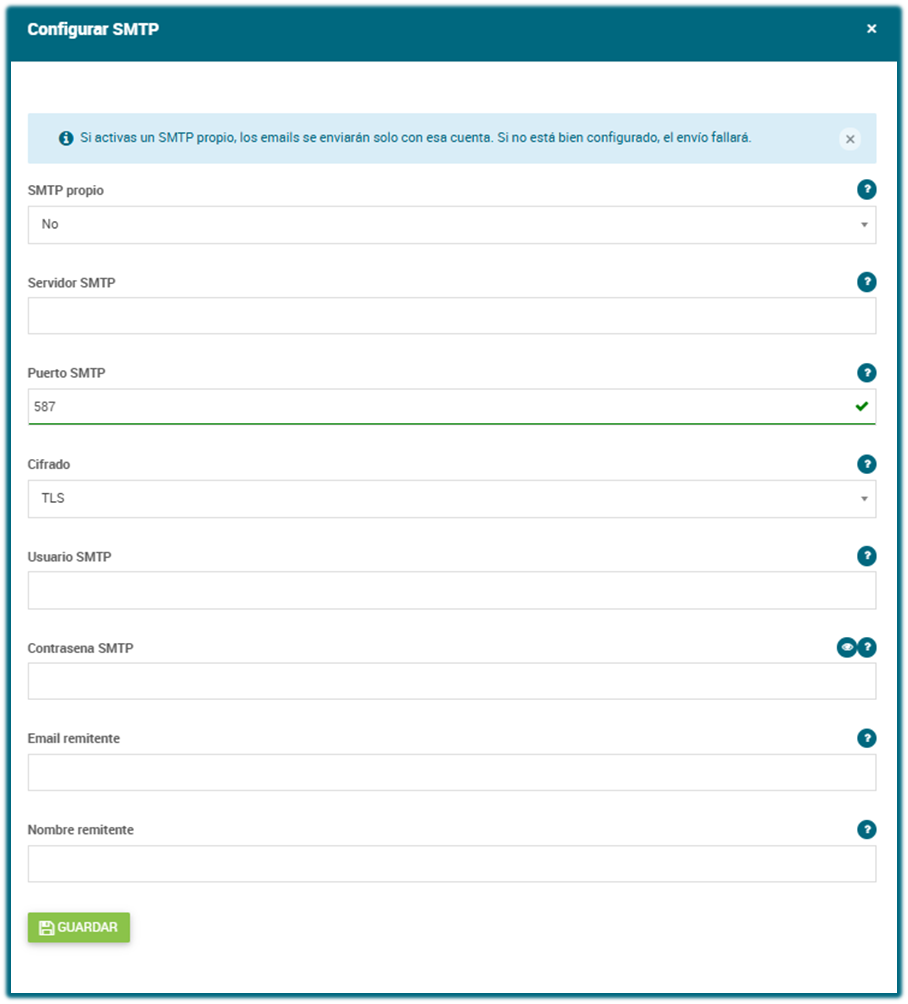 3. Cambiamos SMTP propio a Si y rellenamos todos campos. Si lo necesitas, en este artículo tienes la explicación de cada uno de los campos.