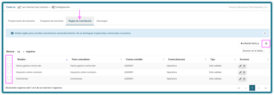 Configuración → Reglas de conciliación